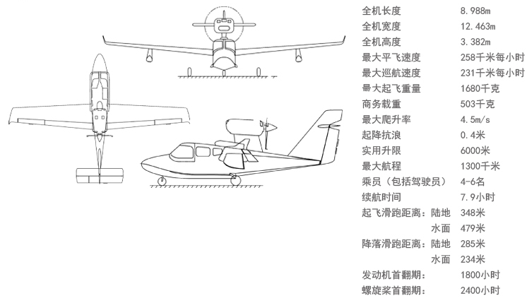 海鷗300飛機是由中航工業石家莊飛機工業有限責任公司和中航工業特種飛行器研究所聯合研制的輕型水陸兩棲飛機。該機按單駕駛體制、雙操縱設計,采用懸臂式中上機翼、“十”字型尾翼、高置單發、前三點可收放式起落架、船身式布局形式,擁有我國完全自主知識產權,填補了我國輕型水陸兩棲飛機研制生產的空白,設計和制造符合中國民航CCAR-23-R3要求。